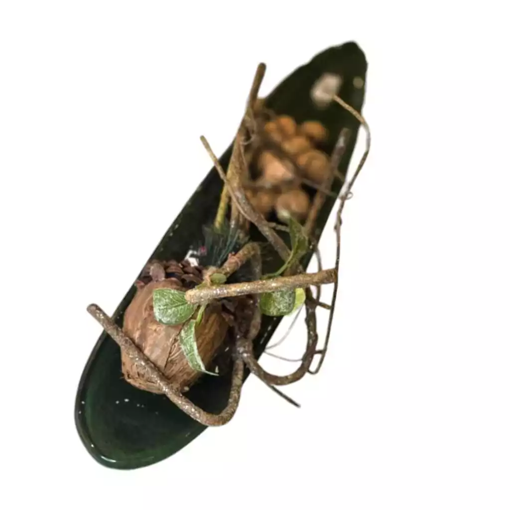 CENTRO DE MESA BARCA VERDE FOLHA - M / 70x13x03 cm (CxLxA), PARA DECORAR OU SERVIR COM ESTILO.
